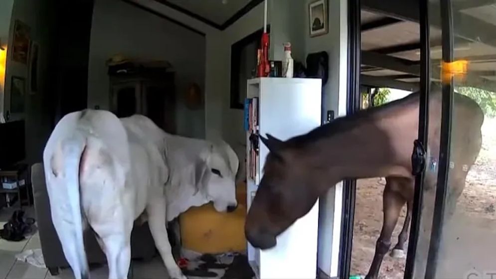 এরপর ধীরে পা ফেলে ডারউইনের ওই বাড়ির ভেতরে ঢুকে পড়ে ‘সু’ নামের একটি পোষা ষাঁড়। তার পেছনেই আসে ‘ক্রিকেট’ নামের একটি পোষা ঘোড়া। ঘোড়াটি ঢুকেই সোফা শুঁকতে শুরু করেন।