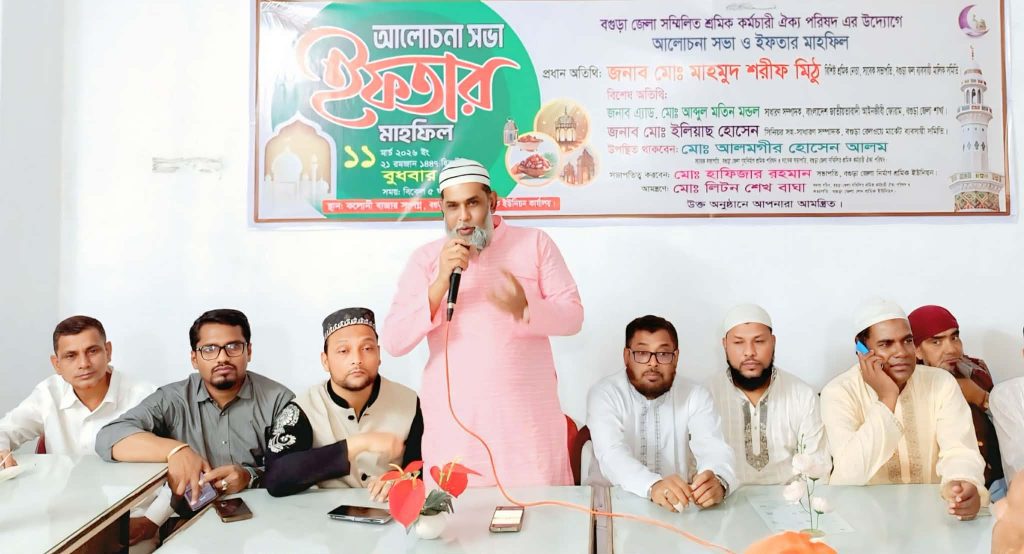 আরমান হোসেন ডলার (বিশেষ প্রতিনিধি) বগুড়াঃ বগুড়া জেলার ৩১টি বেসিক শ্রমিক সংগঠনের সমন্বয়ে গঠিত বগুড়া জেলা সম্মিলিত শ্রমিক-কর্মচারী ঐক্য পরিষদের উদ্যোগে আলোচনা সভা ও ইফতার মাহফিল অনুষ্ঠিত হয়েছে। বুধবার বগুড়া শহরের কলোনী বাজার সংলগ্ন বগুড়া জেলা নির্মাণ শ্রমিক ইউনিয়ন কার্যালয়ে এ অনুষ্ঠানের আয়োজন করা হয়। এতে জেলার বিভিন্ন শ্রমিক সংগঠনের নেতৃবৃন্দ, সদস্যবৃন্দ ও গণ্যমান্য ব্যক্তিবর্গ উপস্থিত ছিলেন।