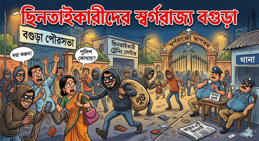 সম্পাদকীয়ঃ- বগুড়া বর্তমানে ছিনতাইকারীদের অভয়ারণ্যে পরিণত হয়েছে, যা জনমনে চরম আতঙ্ক সৃষ্টি করছে। সাম্প্রতিক মাসগুলোতে শহর ও শহরতলীর বিভিন্ন স্থানে ছিনতাইয়ের ঘটনা আশঙ্কাজনক হারে বৃদ্ধি পেয়েছে, যেখানে কেবল অর্থ বা সম্পদ নয়, ছিনতাইকারীদের ধারালো অস্ত্রের আঘাতে অকাতরে প্রাণ যাচ্ছে সাধারণ মানুষের।