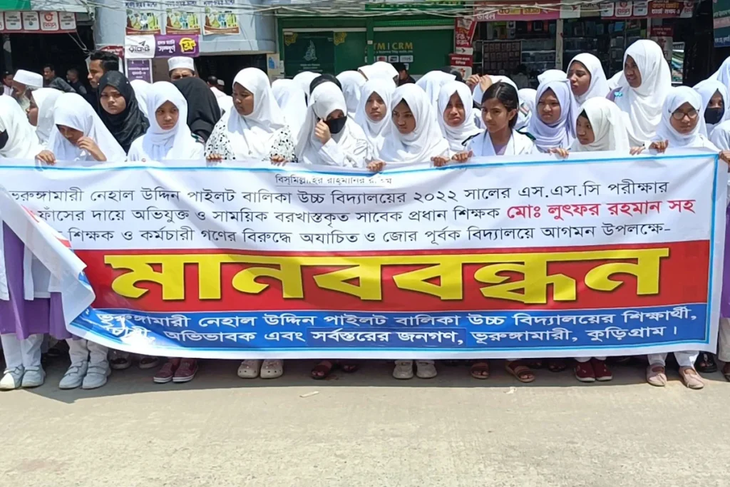 কুড়িগ্রামের ভূরুঙ্গামারীতে ২০২২ সালের এসএসসি পরীক্ষার প্রশ্নপত্র ফাঁসের ঘটনায় অভিযুক্ত শিক্ষকদের পুনরায় বিদ্যালয়ে সংযুক্ত করার প্রতিবাদে মানববন্ধন ও স্মারকলিপি প্রদান করেছেন শিক্ষার্থী ও অভিভাবকরা।